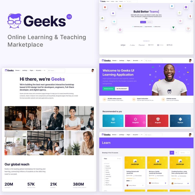 Geeks, tamamen duyarlı ve modern bir premium WordPress temasıdır. Geeks tasarımı, akademi ve çevrimiçi kurs pazarı için uygundur. Geeks, güzel görünen içerik oluşturmanıza yardımcı olmak için temiz ve tutarlı sayfa tasarımları sağlar. Geek, mümkün olan en iyi web sitesi ve web uygulaması projelerini oluşturmanıza yardımcı olan, zengin özelliklere sahip bileşenler ve güzel tasarlanmış sayfalardır.